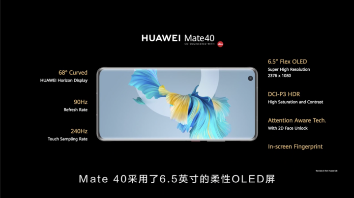 Mate40 上搭载的是一块 6.5 英寸 2376×1080 分辨率的柔性 OELD 屏,具备 240 触控采样率和 90Hz 高刷新率。最大的亮点是 Mate 系列终于用上了高刷新率屏幕,不过 Mate40 系列选择的是 90 Hz 而非 120 Hz 刷新率,目的是实现功耗与观感的平衡。