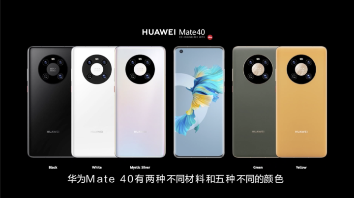 Mate40 和 Mate40 Pro 一样共具备五种配色,新增的秘银色在不同的光线下会反射出不同颜色。另外还有常规的黑色与白色。