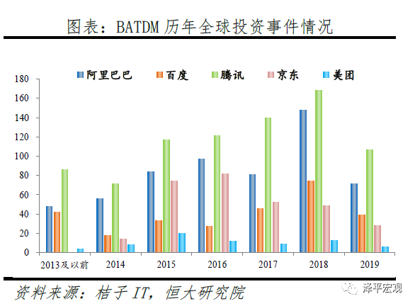 宏观经济承压、优秀标的减少,2019年各大互联网巨头投资行为均有所收紧。2019年阿里巴巴及相关企业共进行71件全球投资行为,较上期下降52%;百度及相关企业共进行39件投资行为,较上期下降47.3%;腾讯及相关企业共进行107件投资行为,较上期下降36.3%;京东及相关企业共进行28件投资行为,较上期下降42.9%;美团及相关企业共进行6件投资行为,较上期下降53.8%。