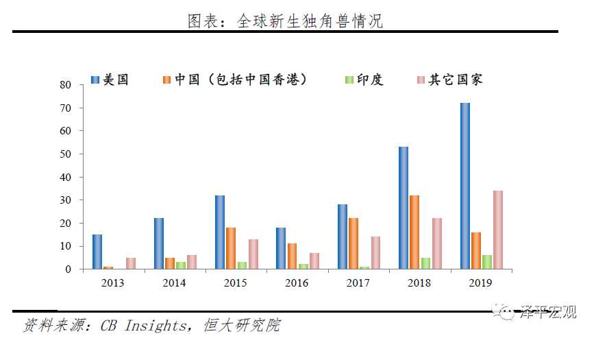 中美印位列新生独角兽数量前三。2019年全球新生独角兽共128家,美国、中国、印度为新生数量前三,分别为72家、16家、6家。中国经济增速放缓、互联网和移动互联网市场格局逐渐固化,2019年中国新生独角兽数量较2018年减少50%。