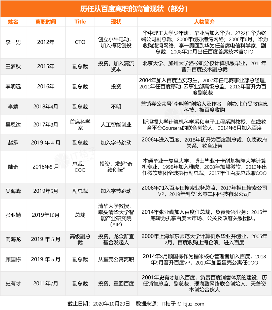 借此机会,IT 桔子盘点一下从百度离职的高管都去哪了。