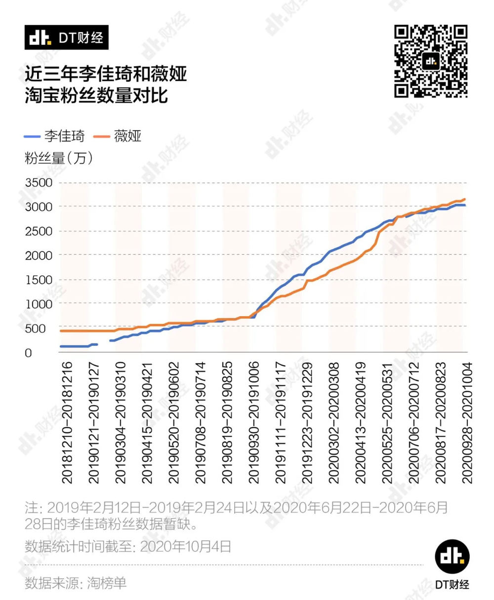 而薇娅虽然在淘宝起步更早,但早期影响力一直仅限于“淘系”内部。淘榜单数据显示,直到2019年年底,两人的粉丝才开始飞速上涨。并在短短一年时间里,粉丝量均超过了3000万。