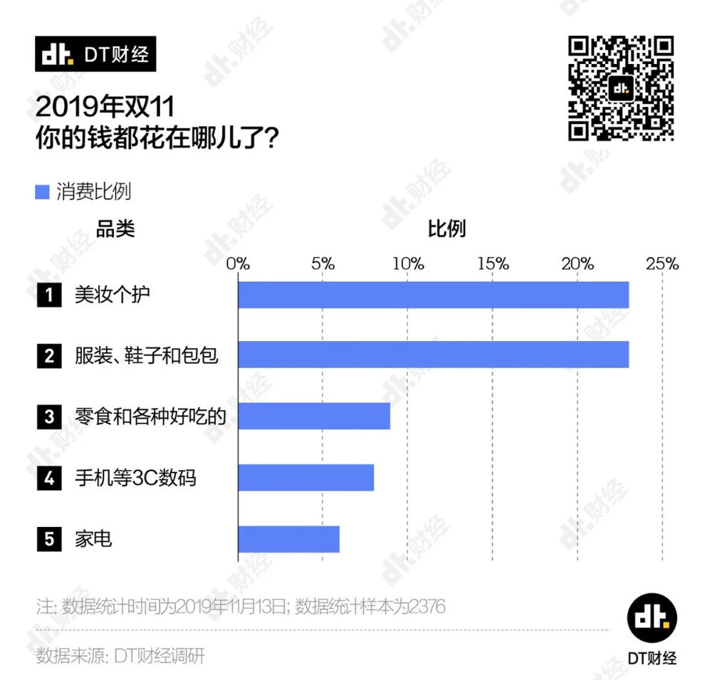 根据DT君在2019年双十一的调研,美妆个护品类也得到了最多消费者的投票。