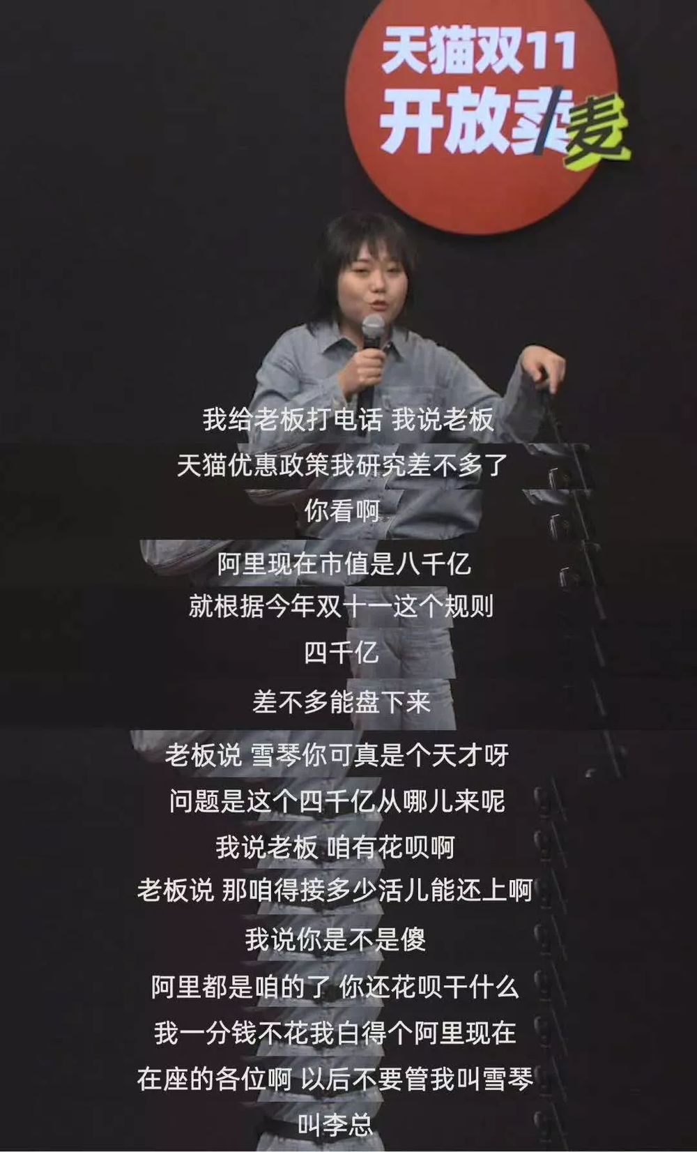 比如近期脱口秀演员李雪琴想4000亿盘下阿里的段子就成功破圈。李雪琴吐槽双十一优惠规则:系统说再买100能减50,完了又说再买200能减100,完了又说再买500能减300,是不是买100万就能减50万呢。 李雪琴秀出神逻辑,教大家如何三步买下阿里↓