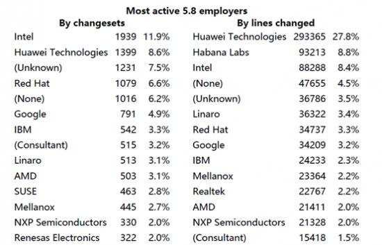 最新发布的Linux Kernel 5.8版本中,华为成为内核代码贡献排名第二。