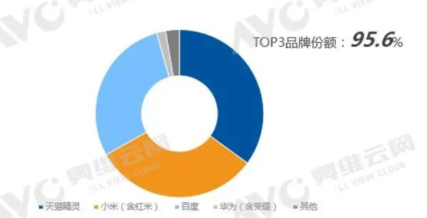 这个数据与另外两家市场研究机构欧睿国际和奥维云网的研究基本一致。中国智能音箱市场竞争格局呈现三足鼎立的态势,行业三强合计占据了95%的市场份额。