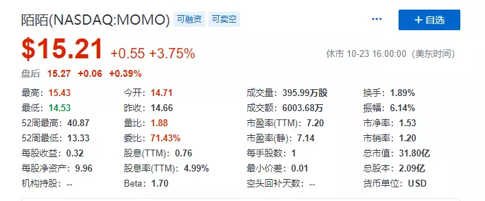 截至北京时间10月24日下午,陌陌股价收于15.21美元,相比前一日14.66的价格小幅上涨3.7%。