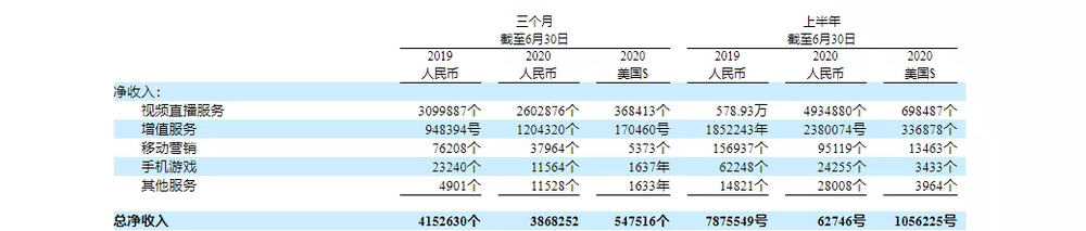 手机游戏收入为1160万元人民币(160万美元),较2019年第二季度的2320万元人民币同样下降了50%。