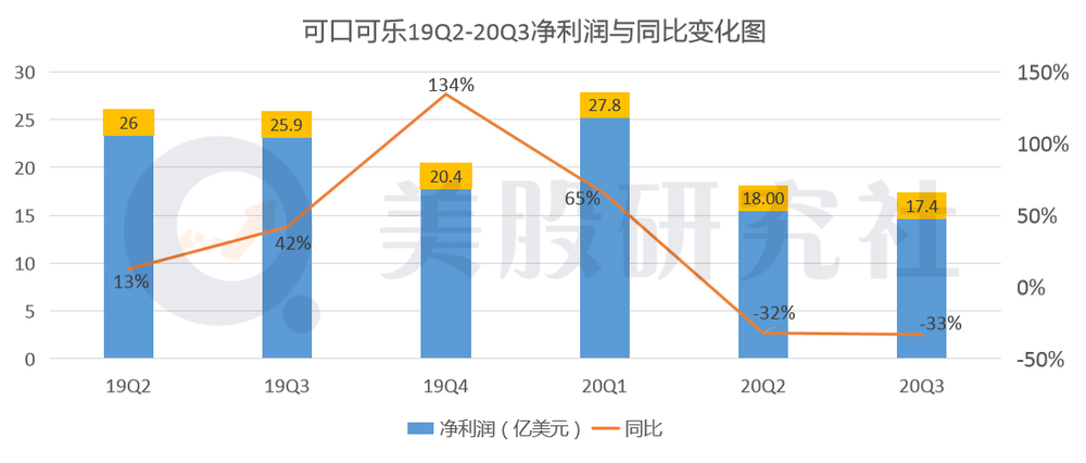 最新财报数据显示:本季度可口可乐的净利润为17.4亿美元,相较于去年同期的25.9亿美元,同比下滑33%,上个季度的净利润表现为18亿美元,环比下滑3.3%。