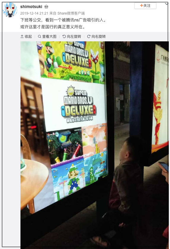 「或许这里才是国行的真正意义所在。」我想起@shimotsuki所表达的一句话。这名微博用户的感慨,源于一名儿童望着腾讯 NS 广告出神的场景。