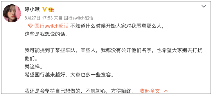 @婷小啾最大的愿景,是做国内最大的车队——「人最多,影响力最大,且注重培养新人的车队。」这对她来说是个挑战。在8月26日,队长@婷小啾在微博上发长文,讲述了自己经营车队的心路历程。她提到其中一些困难,包括:被高端玩家排挤、被其他车队挖墙角、被外服玩家骚扰。迫不得已,「Cch车队」中断了新人招募。