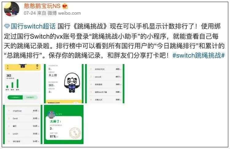 官方也在尝试通过本地内容来构筑国行的卖点。9月28日,腾讯推出了健身环国行小程序。就像「微信运动」一样,健身环小程序可以记录玩家的运动时长、完成次数等各项数据,并且支持「分享」、「排名」等社交玩法。