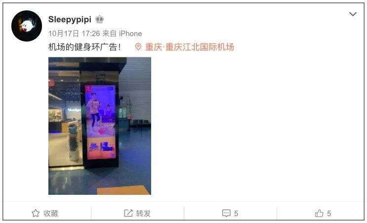 与此同时,健身环的广告也遍布于线下。过去两个月时间里,你能够在一二线城市的机场、商超、公交亭、电梯里遇见健身环的户外广告。不少用户带着惊讶的情绪,又把这些广告场景分享到了社交平台。