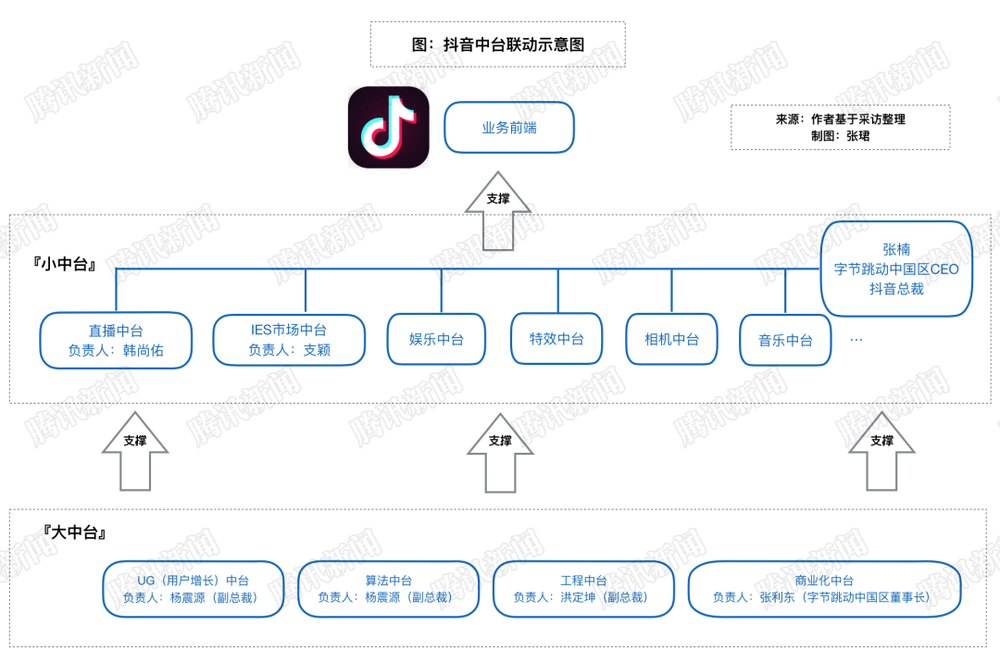 在张一鸣领导下,字节对信息安全戒备心极重,内部从不公开组织架构和职级。一是防止竞争对手研究和挖人,二是避免因职级高低给沟通带来隔阂。任何员工身处其中都像“盲人摸象”。基于采访,我尽可能梳理了抖音与中台联动示意图。