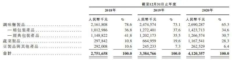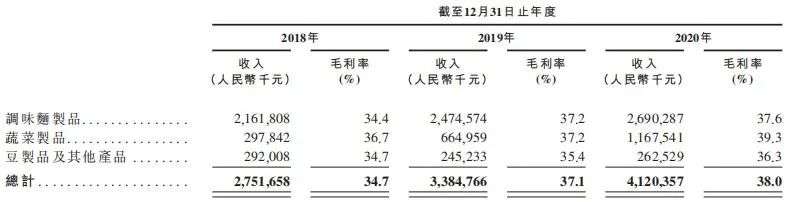 分产品来看,2020年卫龙三大类产品中,调味面制品营收26.9亿元,占比65.3%;蔬菜制品收入11.68亿元,占比28.3%;豆制品及其他产品2.63亿元,占比6.4%。