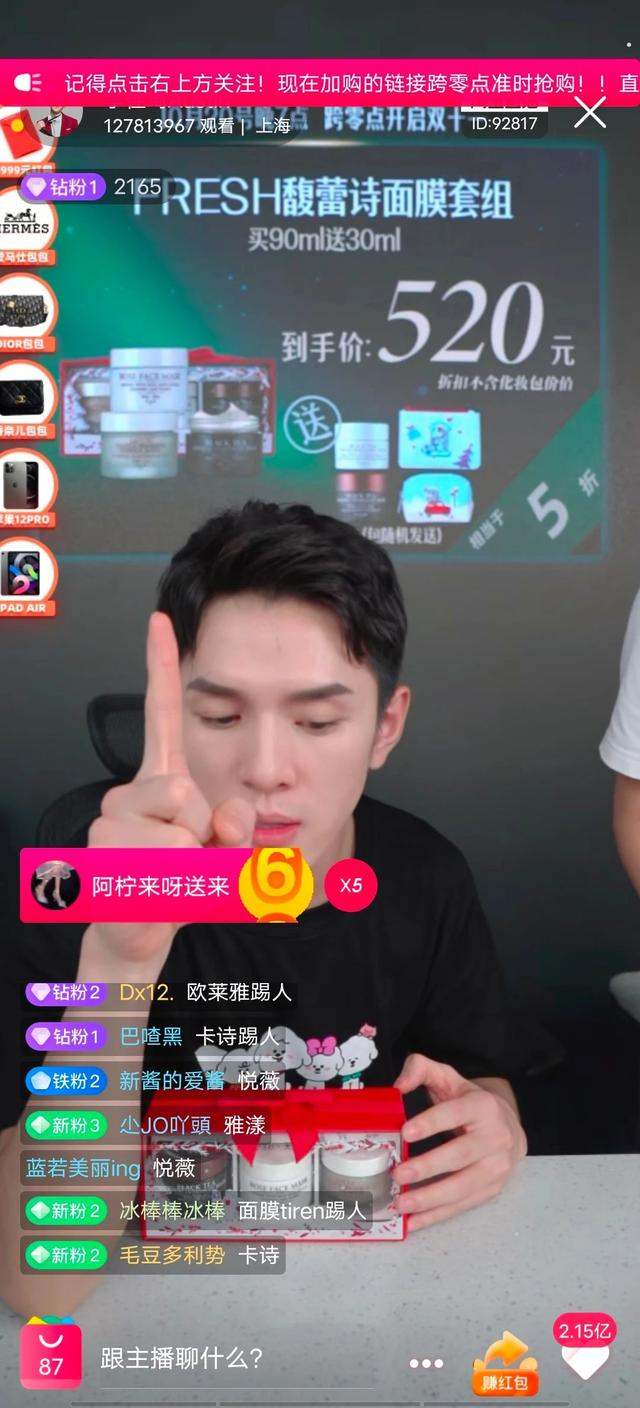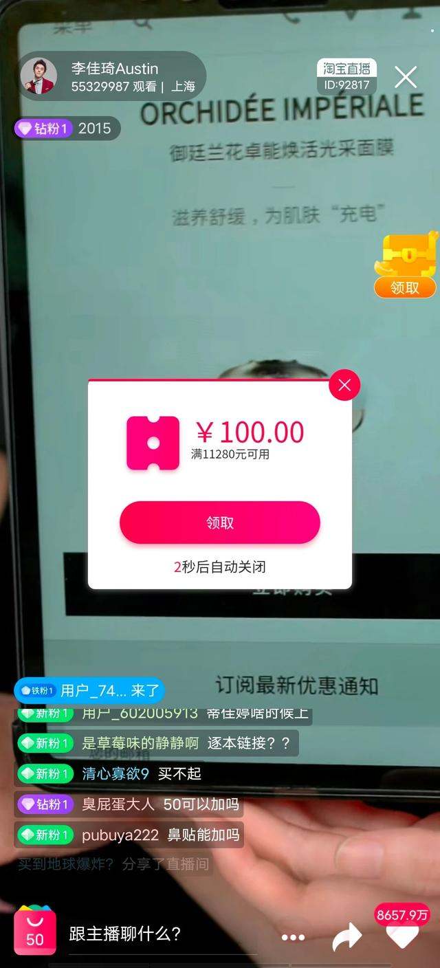 昨晚,李佳琦在直播间上线了一款价值11280元贵妇面霜,李佳琦称,连他本人也想抢购,可就在商品上架后几秒内,就显示库存不足,已被抢光。其他不少价格在200元到5000元区间的产品,也在上链接后的数秒内被抢光。足以看出直播间里高涨的消费热情。
