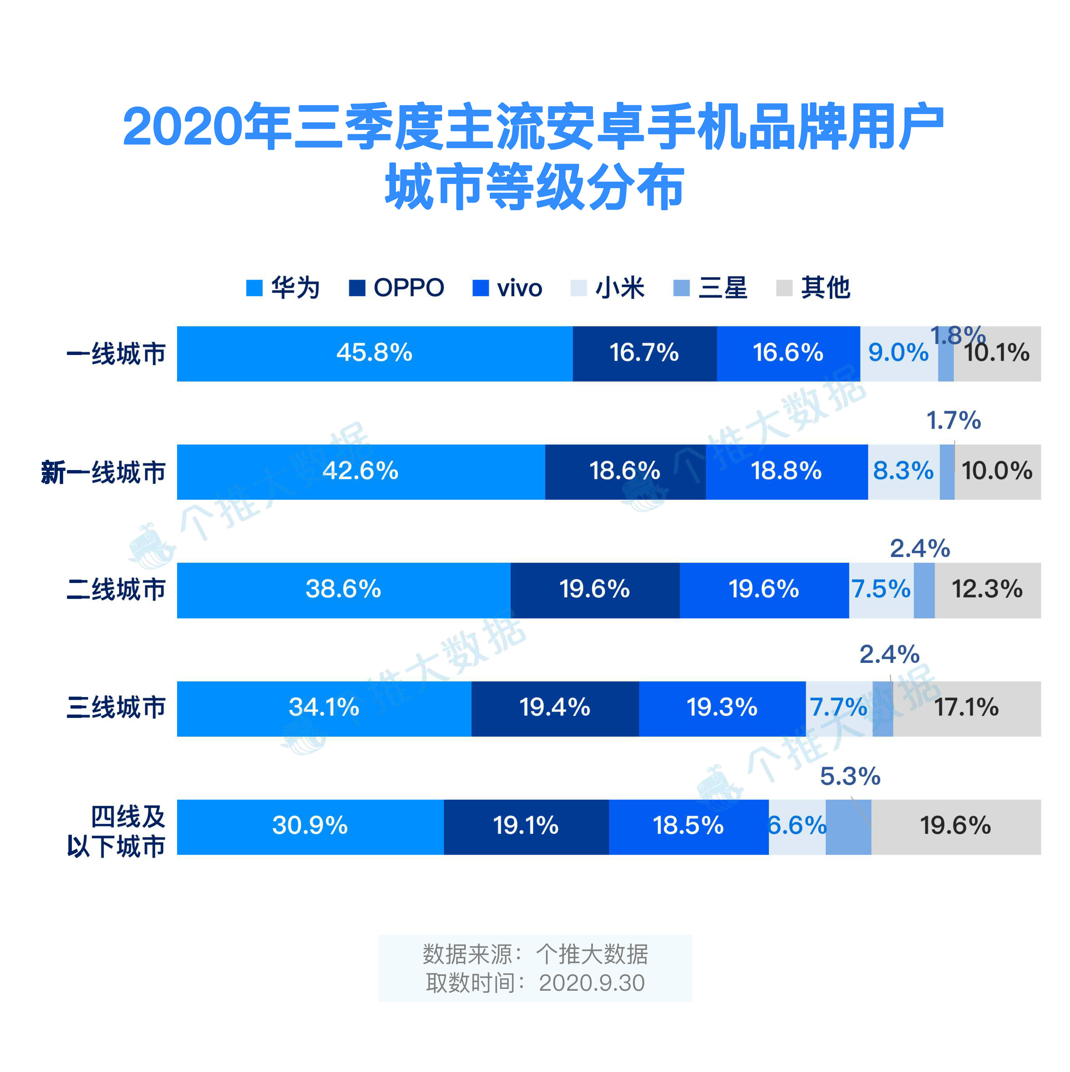 各类城市热门机型分布TOP5数据显示,一线、新一线和二线城市最受欢迎的TOP5机型几乎被华为占领,华为Mate 30系列、P30系列以及Nova 5 Pro屡屡上榜。OPPO手机在下沉市场表现亮眼,其中OPP0 A5和OPPO A57凭借超高的性价比占领三线城市、四线及以下城市的前两席。