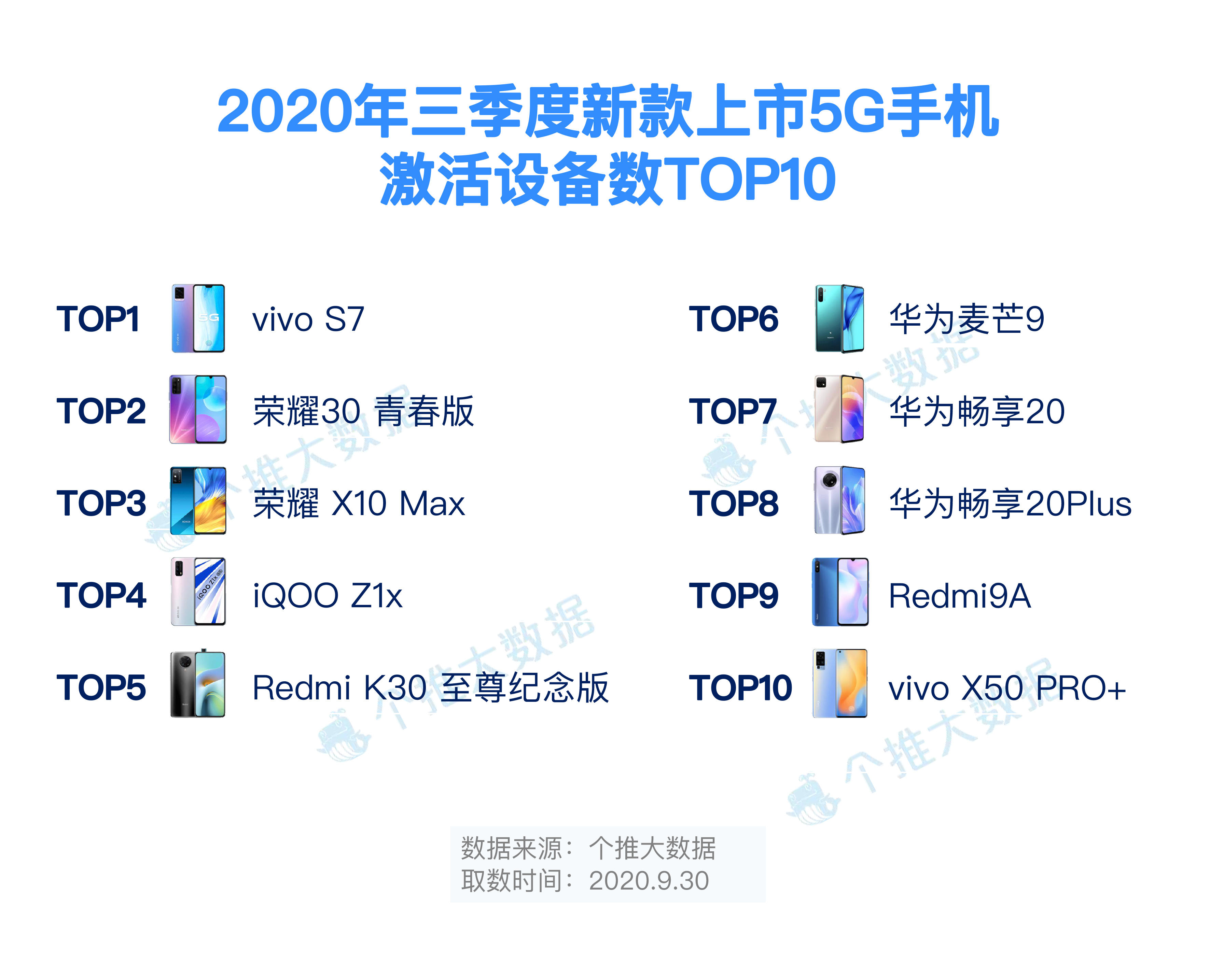 2020三季度,5G手机市场华为、vivo和OPPO市占率排名前三。其中,vivo 5G手机的占比15.6%,相比2020年上半年的10.2%,上升了5.4%,且vivo S7成为三季度新款上市5G手机激活设备数TOP1。