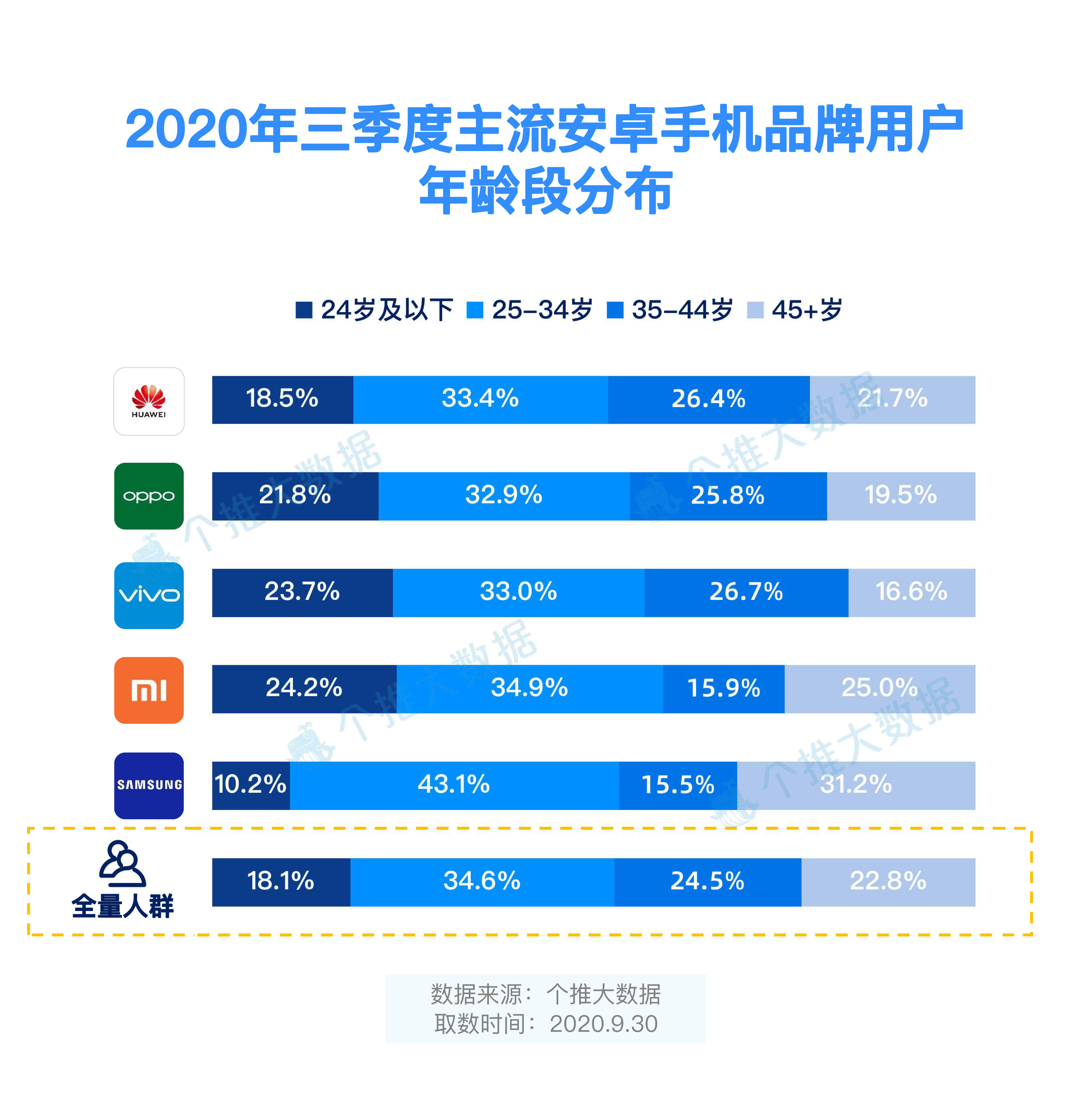 每日互动个推大数据显示,25-44岁年龄段人群依然是安卓智能手机的主流用户群体;OPPO、vivo和小米手机24岁及以下用户占比均高于全量人群24岁及以下人群占比;三星手机25-34岁年龄段用户占比达43.1%,远高于全量人群中该年龄段人群占比。