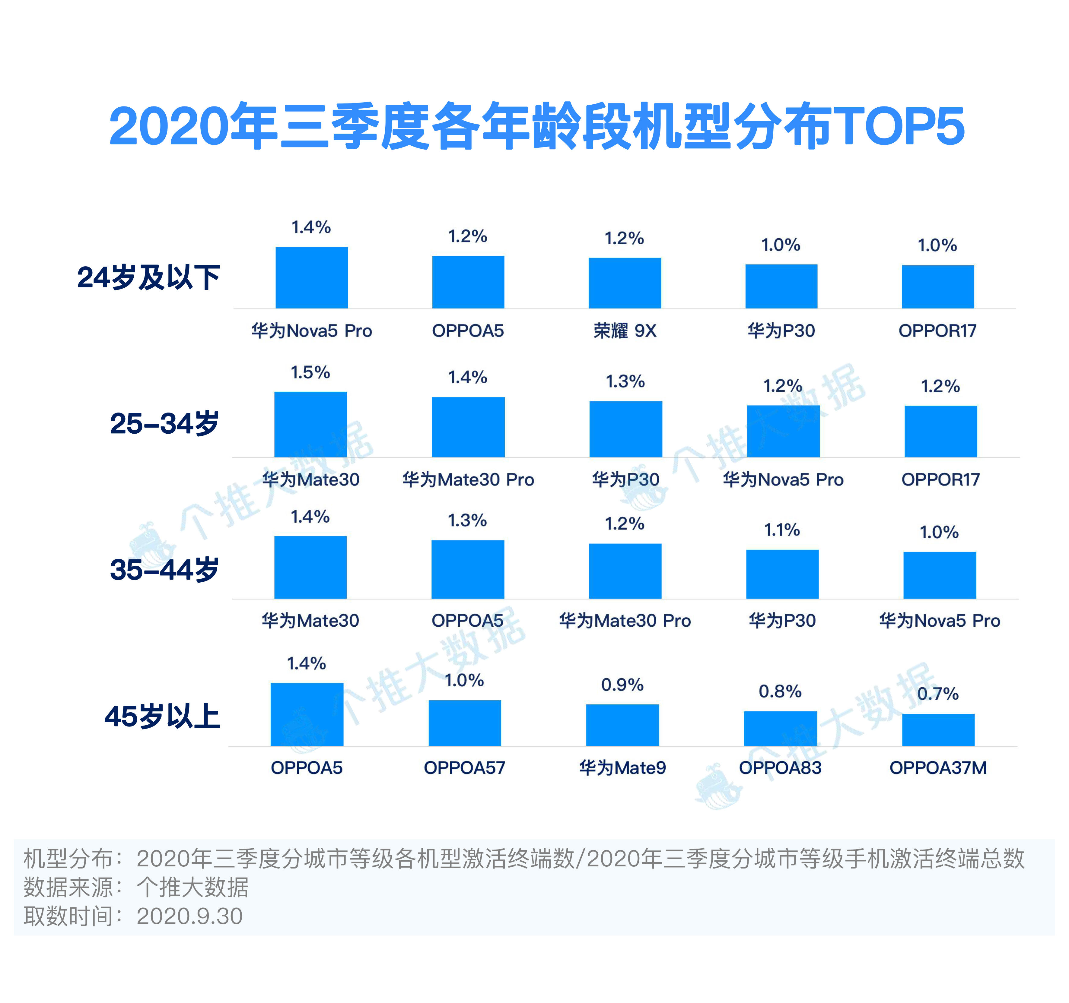 分年龄段用户群体洞察显示,华为Mate30系列入围2020“爆款”机型,深受25-44岁年龄段主流手机用户的欢迎;OPPO A5受众年龄段最广泛,分别登上24岁及以下、35-44岁、45岁以上年龄段热门机型TOP5榜单。