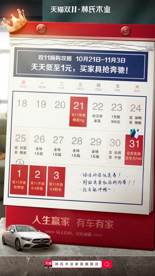 基于林氏木业对年轻一代的深刻洞察,发现“车”和“房”普遍成为年轻人安家置业路上的两大难题。整个双11期间推出“买家具抢66万奔驰,疯抢万份半价爆款”的重磅优惠力度,为当代置业青年带来了“车房两得”的独家宠爱,一次性解决困扰广大置业青年的人生压力”,提高生活幸福感和激活消费欲望。在双11买买买过程中一口气晋升“人生赢家”,助力用户实现“有车有家”的赢家梦想,让家升级为“人生赢家”本家,甩开市场比比皆是的混乱价格战,打出一手漂亮的“感情牌”。