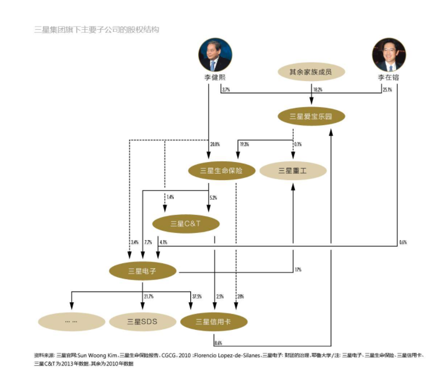 为了将控制权拿到手里,大多数韩国财阀都会选择用错综复杂的交叉持股保持控制权,即便李氏家族在三星的各个实体中只拥有相对较少的股份。例如,根据彭博社的数据,李健熙只拥有三星电子3.8%的股权,但他却是三星人寿最大的股东,拥有20%的股份。三星人寿则拥有三星电子8%的股份。这些股份加上在其他实体所拥有的股份,使李健熙得以控制三星电子逾20%的股份。