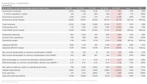 10月22日,特斯拉公布了2020年第三季度财报。报告显示,特斯拉第三季度总营收为87.71亿美元,比去年同期的63.03亿美元增长39%,比上一季度的60.36亿美元增长45%。归属于普通股股东的净利润为3.31亿美元,与去年同期归属于普通股股东的净利润的1.43亿美元相比增长131%,实现连续5个季度盈利,股价盘后涨超4%。