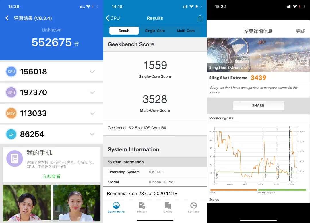 在三大主流跑分测试平台中,iPhone 12 Pro获得了不错的成绩。其中GeekBench5 CPU单核1559,多核3528,而iPhone 11 Pro Max CPU单核为1327,多核3303。