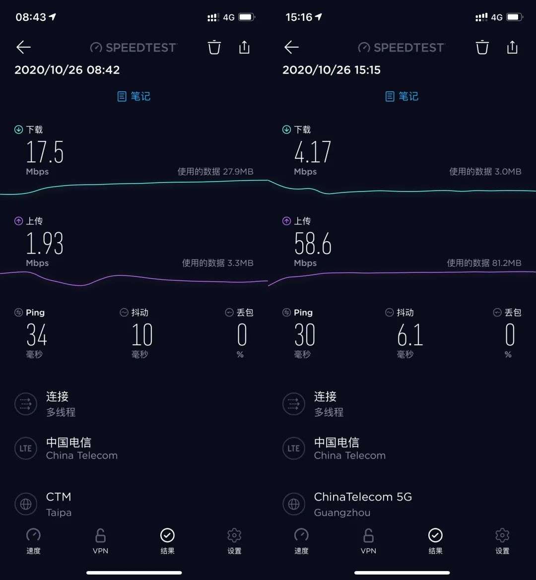 在电梯和地铁等信号较差的区域,iPhone 12 Pro的5G信号会变为4G。尽管下载和上传速率都有所下降,但是手机依旧可以正常使用,无论是通话还是上网。