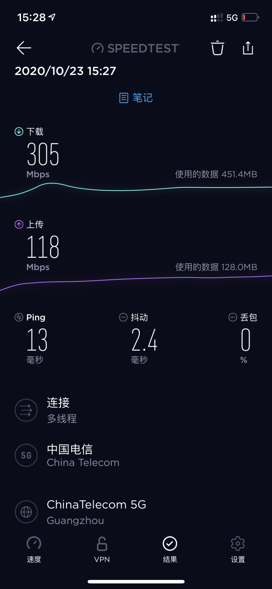 室内环境下,iPhone 12 Pro依旧可以搜索到5G信号,测得的下载速率为305Mbps,上传速率为118Mbps。