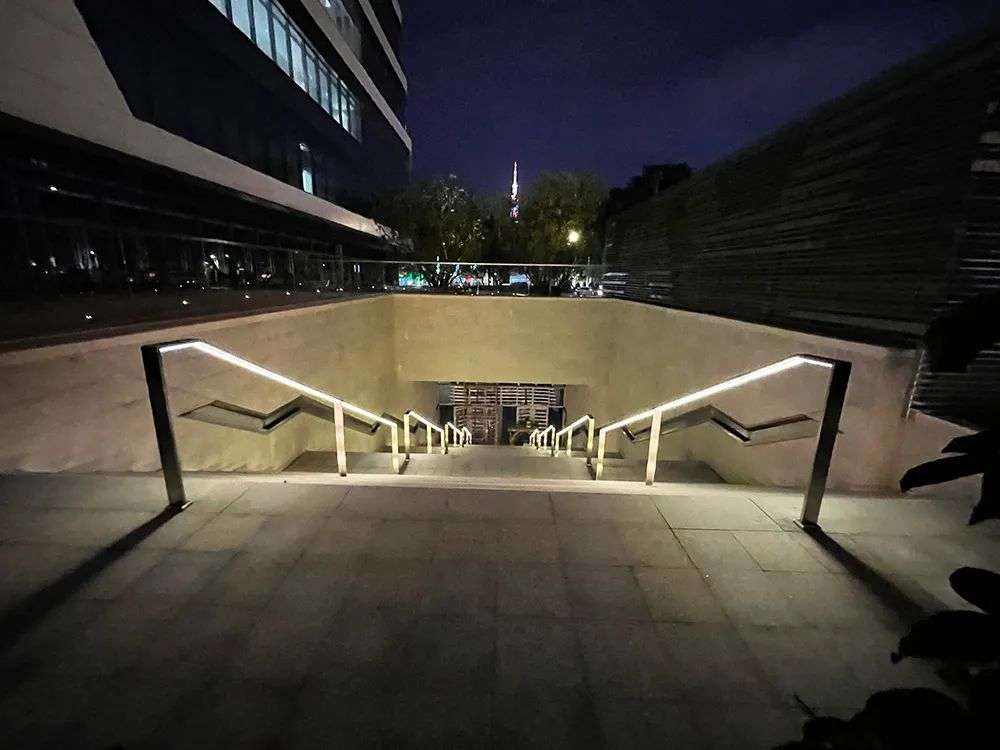 还有更严重的鬼影情况,我们可以看到样张中间有三条蓝色线条,这是因为iPhone 12 Pro镜头将反射了画面中三条光柱的倒影。