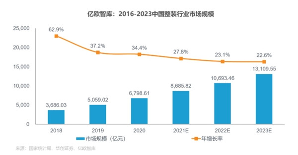 据亿欧智库《2020-2021家居行业年度盘点报告》显示,整装已经成为家装行业新的增长点。根据亿欧智库数据,预计2021年整装行业的市场规模将达到8685.82亿元,并将持续保持20%以上的年增速高速发展。