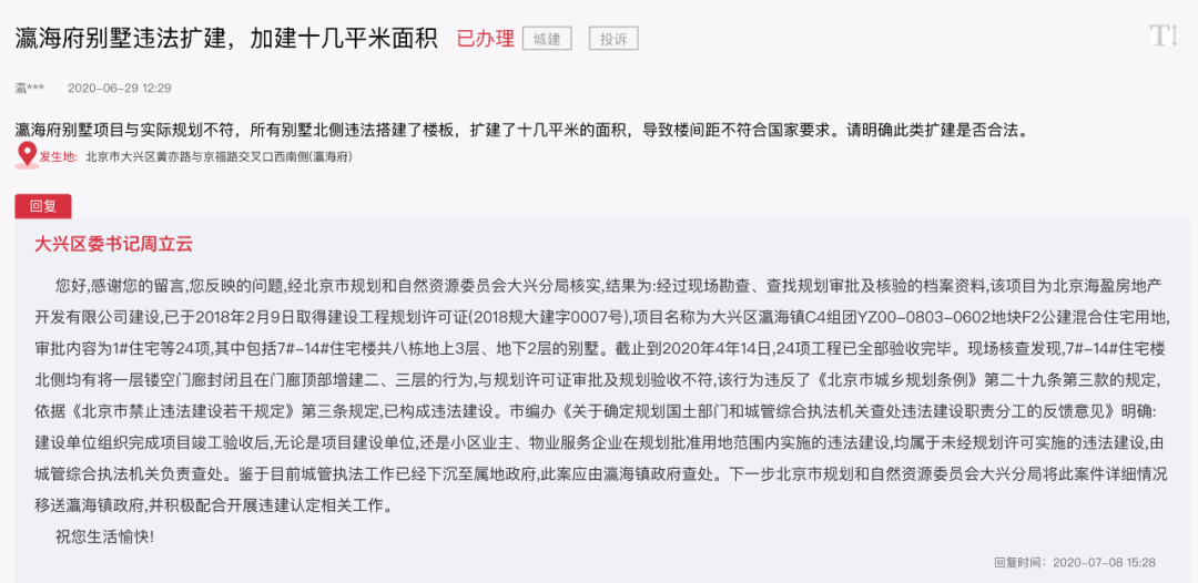 瀛海府事件起源于四个多月前,有人在人民网地方领导留言板中咨询瀛海府问题,称瀛海府别墅项目与实际规划不符,所有别墅北侧违法搭建了楼板,扩建了十几平米的面积,导致楼间距不符合国家要求。请明确此类扩建是否合法。