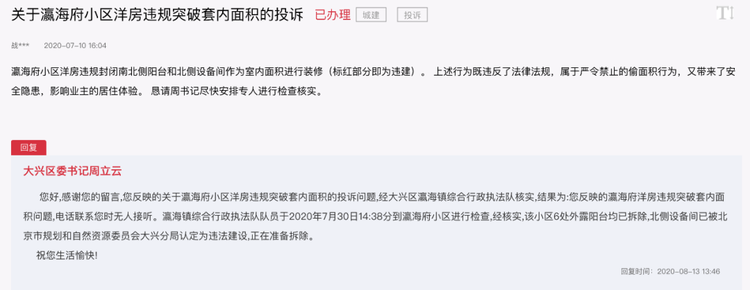 除了瀛海府别墅被爆出占用公共空间面积,七月份,又有人将瀛海府洋房的违规行为在人民网捅了出来。“瀛海府小区洋房违规封闭南北侧阳台和北侧设备间作为室内面积进行装修。上述行为既违反了法律法规,属于严令禁止的偷面积行为,又带来了安全隐患,影响业主的居住体验。”