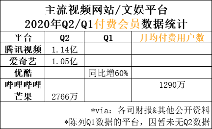 截至2019年第三季度末,爱奇艺订阅会员规模达到1.058 亿;彼时,腾讯视频订购账户数为1.002亿。截至2020年第二季度,爱奇艺总订阅会员人数为1.049亿;而腾讯视频的视频服务会员数增长至1.14亿。“腾爱cp”一如既往的你追我赶,而优酷则宣布2020年Q1付费会员同比增长60%。而今,在优爱腾三巨头身后,是努力追赶的B站和芒果TV。