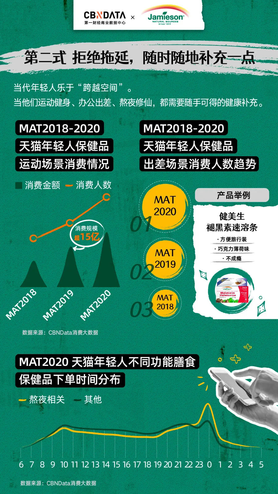 繁重的工作压力也让越来越多的年轻职场人对保健品有强烈需求。年轻消费群体在工作相关保健品上的消费增速远高于整体,年轻人保健品的出差场景消费人数也逐年走高。办公室里、出差路上的年轻人一边努力工作,一边保健品傍身。为了在酒店也能获得更好的睡眠,他们或许还会在包里放上一些便携装的褪黑素。