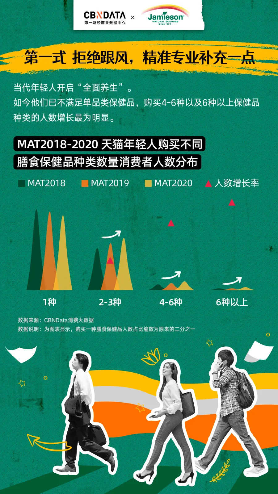 根据《报告》显示,仅满足于单类保健品的年轻人比重越来越小,购买4-6种以及6种以上保健品种类的年轻人增长最为明显。