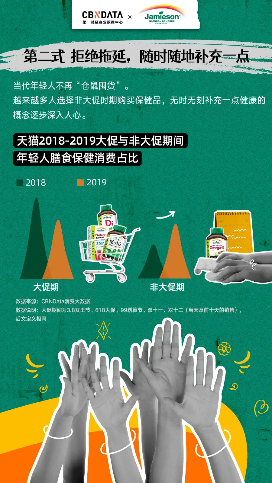 年轻人购买保健品,不局限于大促时期,尤其近两年,年轻人在非大促期间的膳食保健消费占比显著扩大,同时非大促期的消费频次也而明显提升,这也说明了保健品的消费更加日常化,随时购入随时“磕”保健品已成为年轻人生活常态。