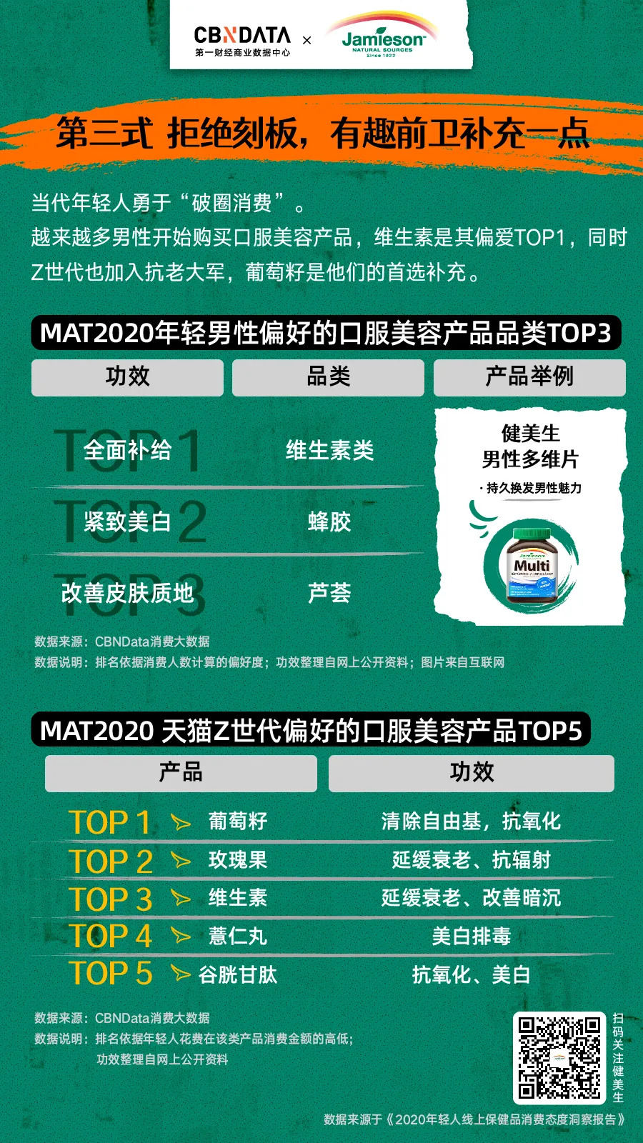 在年轻人的保健品消费当中,还出现了诸如“保健品零食化”、“男性口服美容”、“Z世代抗初老”这样打破我们固有认知的新风潮。