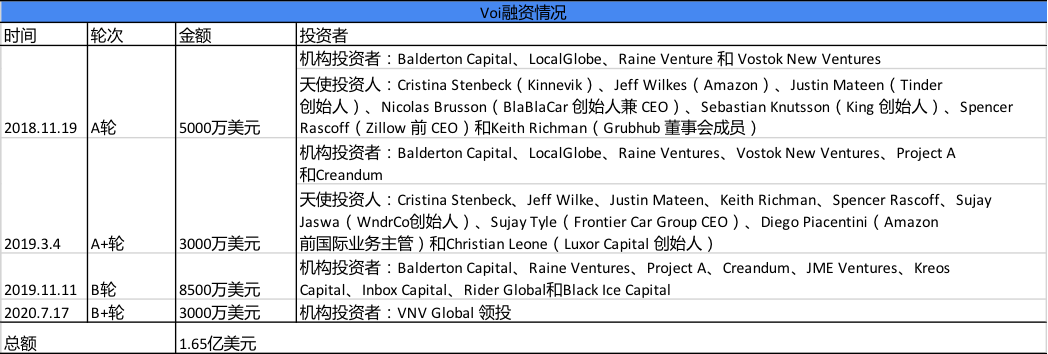 Voi成立于2018年8月,总部位于瑞典阿姆斯特丹,现已入驻欧洲11个国家的40多个城市。成立两年内,Voi共获得4轮融资,共计1.65亿美元,最近一次B+轮融资是在今年7月,投后估值近2.7亿美元。今年6月,Voi宣布实现收支平衡,预计2021年实现盈利。