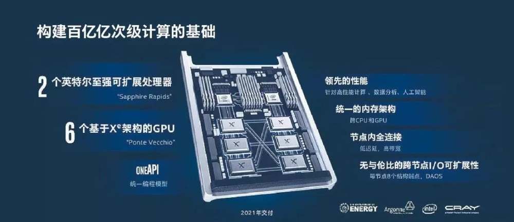 除了守住原有优势,英特尔也在进军英伟达的地盘——独立显卡GPU,为下一代至强CPU搭配六路Xe架构GPU显卡,实现百亿亿次计算,并计划2021年投入美国的下一代超级计算机“极光”(Aurora)当中。