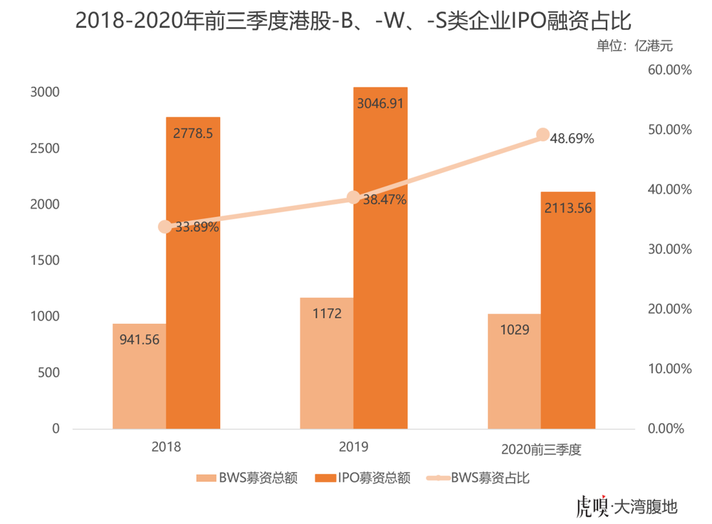 从近两年数据来看,生物科技企业、新经济企业和中概股占香港地区IPO募资额的比重也越来越大。2018年,百济神州、君实生物等五家未盈利生物公司登陆港股,小米集团、美团点评两家公司以同股不同权架构在港上市,融资额累计达941.56亿港元,在港股所有IPO募资总额中占比33.89%。这一数字在2019年增长至38.49%,到了2020年前三季度,已经接近一半。