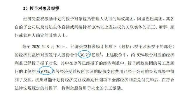 昨天蚂蚁的招股书显示,经济受益权激励计划项下的经济利益所对应发行人股份合计30.79亿股,这里其中有约65%的股份是授予员工及顾问。
