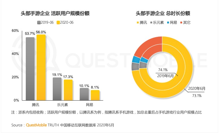 另外,QuestMobile发布的中国移动互联网2020年上半年大报告显示,腾讯系手机游戏产品占到手机行业用户整体规模的73.1%。