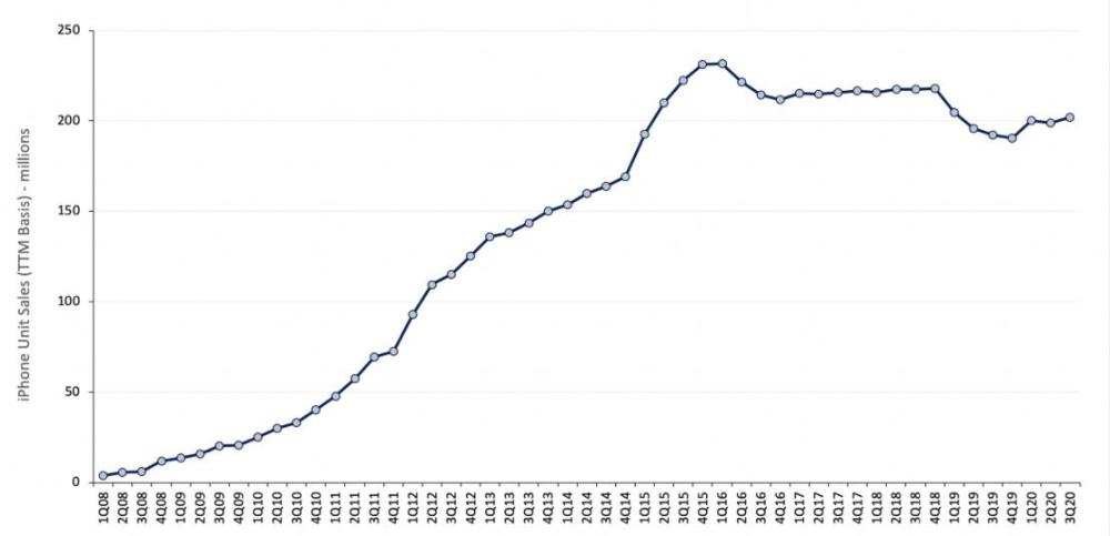 从2008年第一季度到2020年第三季度iPhone销量图表