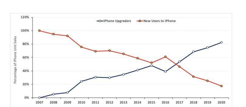 iPhone业务如今已经变成了升级业务。尽管苹果每年仍会带来2000万至3000万的新iPhone用户,但新用户在iPhone总销量中所占的比例却在稳步下降。在2020财年,面向新用户的iPhone销售额可能不到iPhone总销售额的20%,创下历史新低。