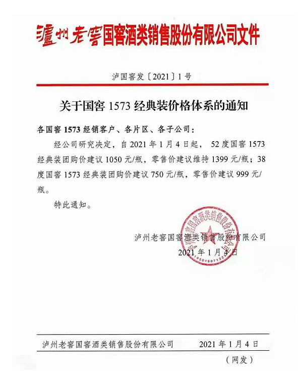 2021年1月4日,酒说从市场获悉,泸州老窖国窖酒类销售股份有限公司(下面简称“国窖公司”)发布《关于国窖1573经典装价格体系的通知》的文