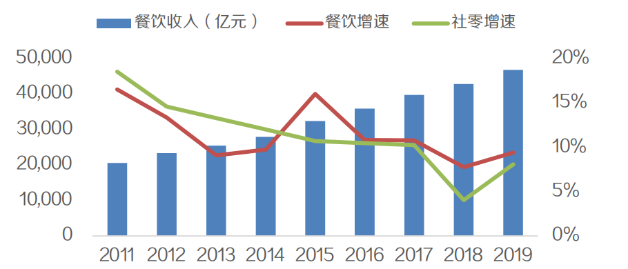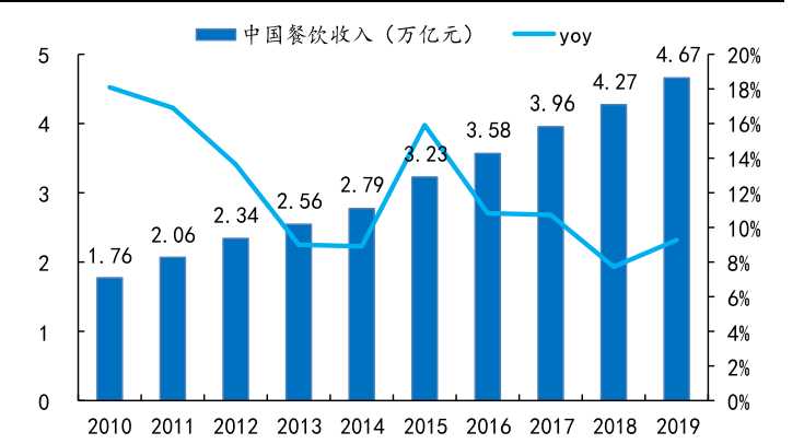 民以食为天,饮食需求是消费者最大、最稳定的需求,这也塑造了我国餐饮行业 4 万亿的市场规模。19 年我国餐饮行业收入达到 4.7 万亿元/+
