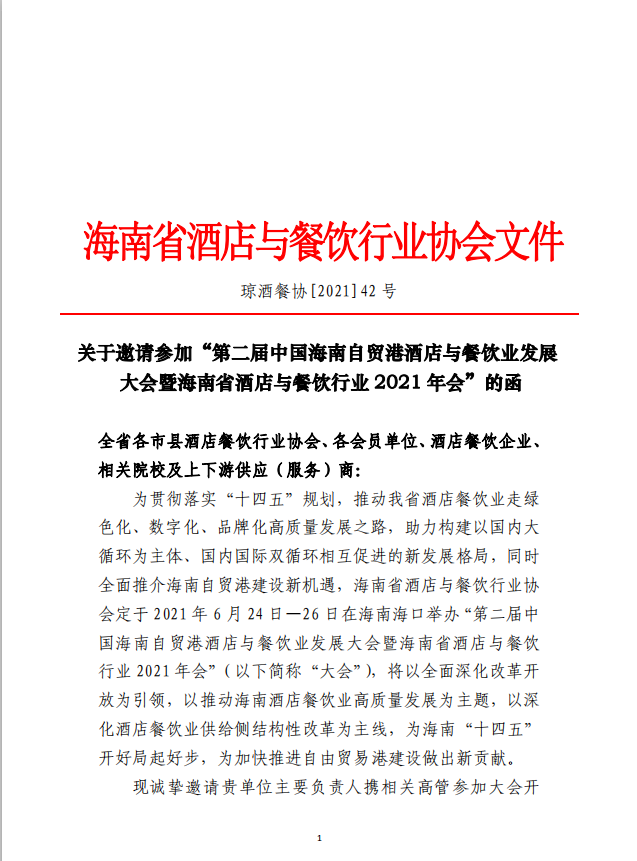 点击上方蓝字关注我们!2021年5月26日-5月29日,海南省酒店与餐饮行业协会...