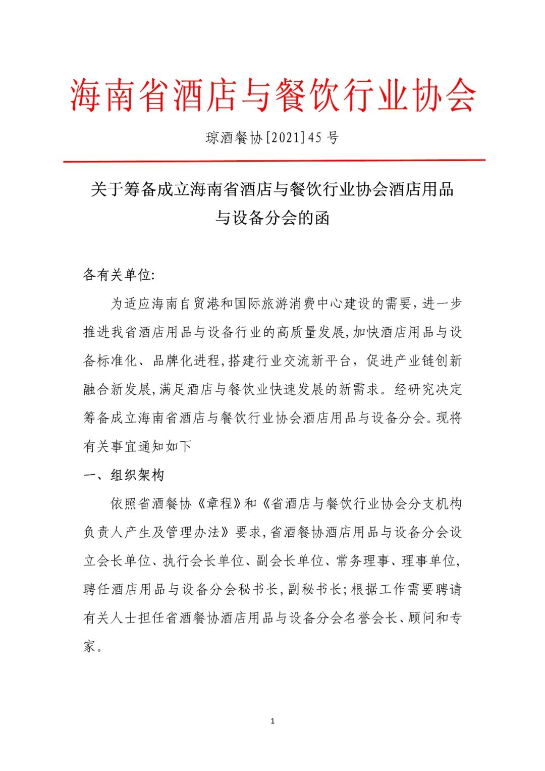 关于筹备成立海南省酒店与餐饮行业协会酒店用品与设备分会的函